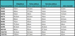 Mõõtude tabel: